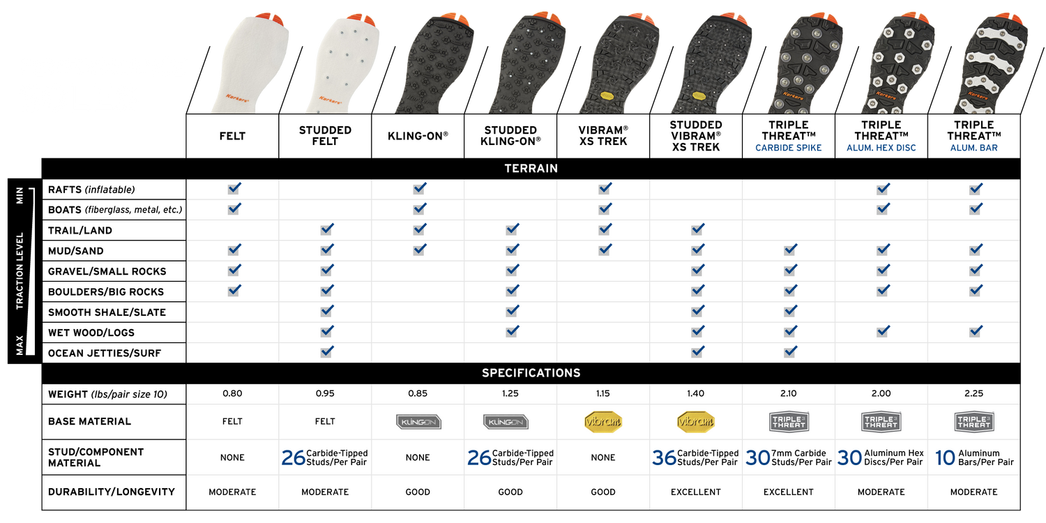 Fishing soles come in whole sizes only and are unisex. The sole of your boot must match the size of your Korkers wading boot to function properly (e.g. Men’s Size 10 Boot = Size 10 Sole, Women’s Size 10 Boot = Size 10 Sole). Boot sizing can be found on the inside tongue label or on the original Korkers boot box or sole box.