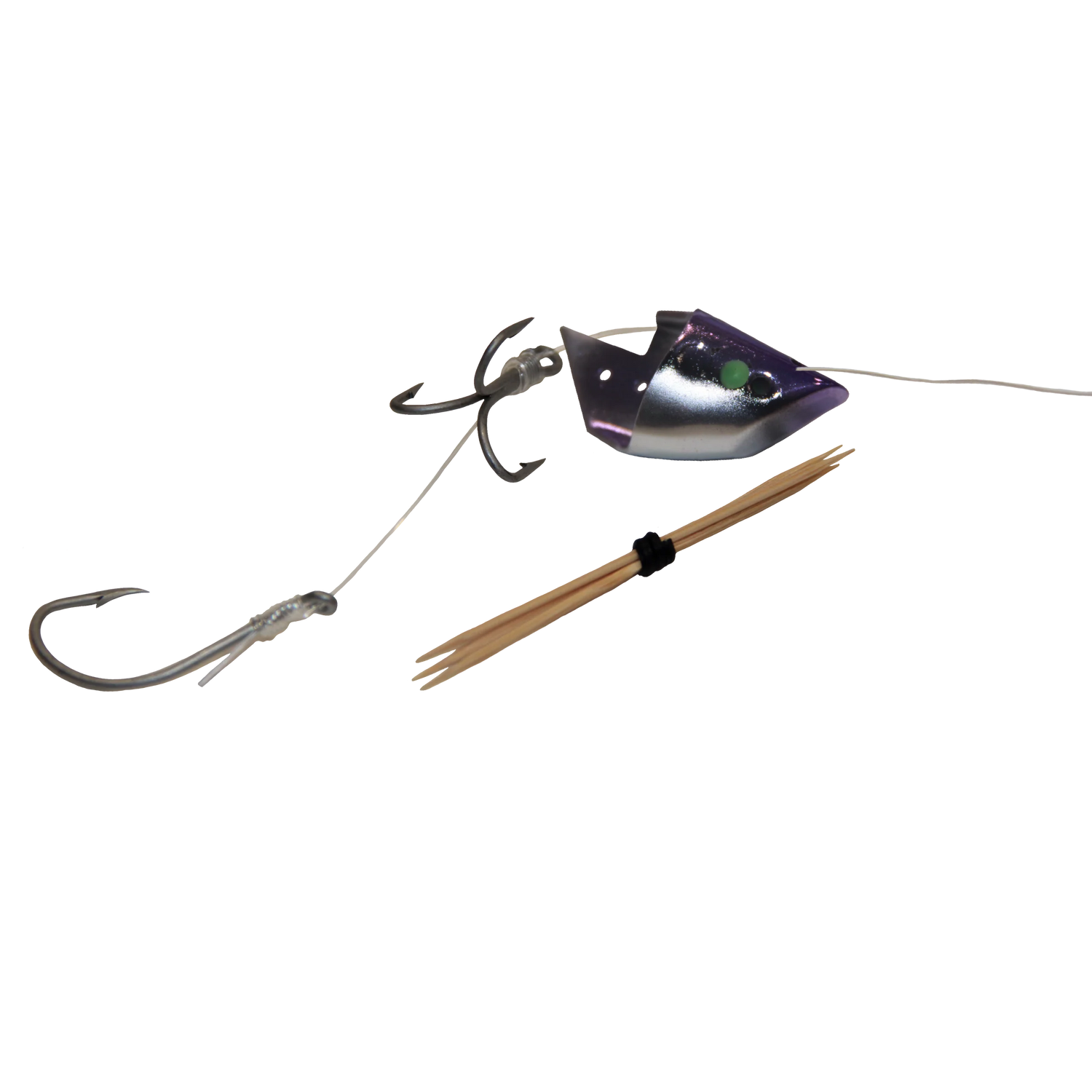 Rigged Anchovy Bait Holders have a VMC #2 treble hook and a VMC 4/0 Octopus Beak stinger hook. It comes with Sufix 84 inch 40 lb test leader line. It is ideal to roll anchovies, herring or plastic baits from 4.5 to 6 inches in length. 3 toothpicks are included in each pack to secure the line.