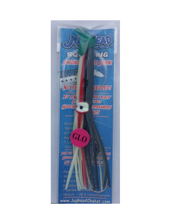 Squid Rigs - Small Jughead: 6' leader, 40lb mono line, 6 bead rolling swivel with 7 luminous beads. 4/0 Siwash hook with 6-1/4" (Kajiki) Squid - UV White, Army Truck Glow, Green Spatterback Glow and Cop Car This Jughead Ultra Violet Squid rig has a UV small Jughead attached to the top of the lure to give it life like action in the water.