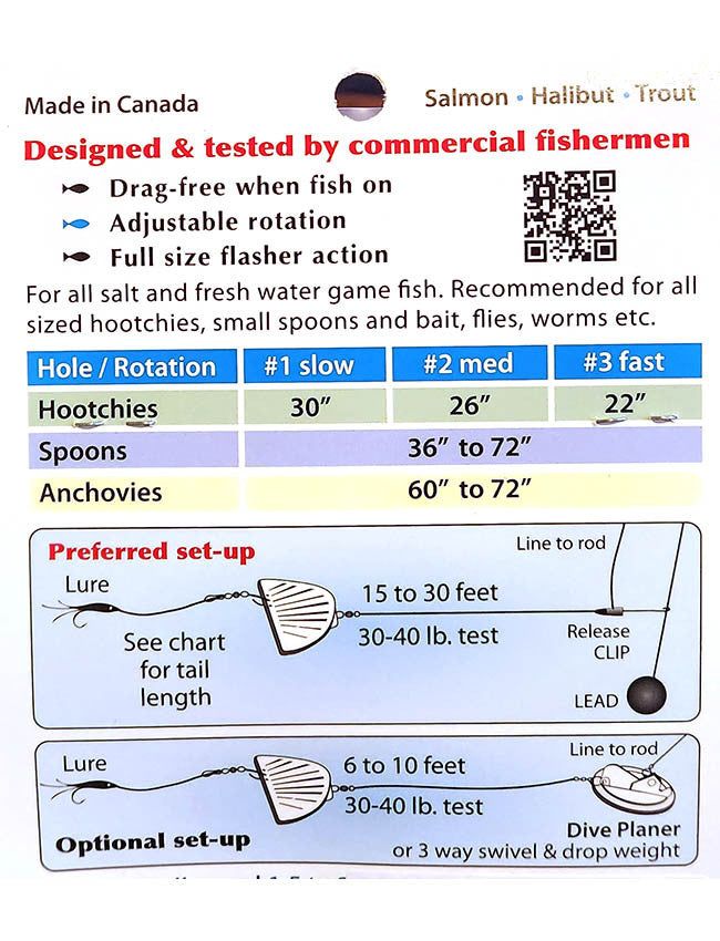 For all salt and fresh water game fish. Recommended for all sized hoochies, small spoons and bait, flies, worms, etc.