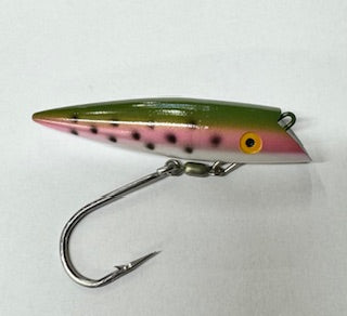 The Tubby was originally designed for fishermen in the Tyee Club in Campbell River, because it will work well at slower speeds. The Tyee Club requires that fishermen are rowing. The Tubby may also be trolled fast and will fish alongside a Classic or spoon nicely.
